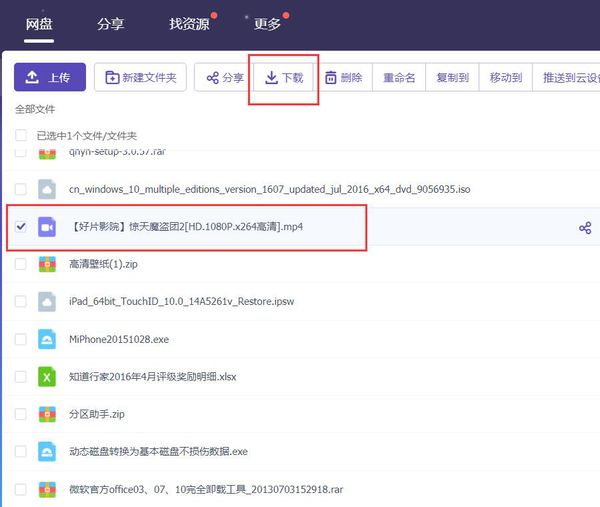 3、等待文件下载完成之后,在网盘中找到该文件,点击顶部“下载”按钮;