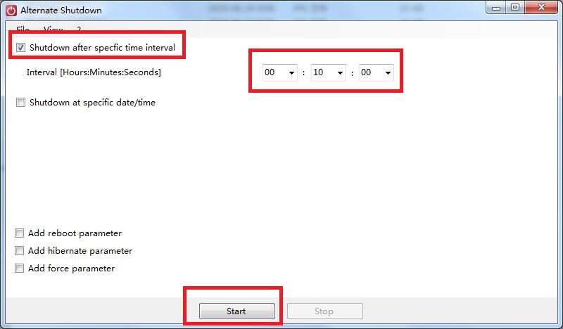 1、安装后打开本软件,然后点击Shutdown after specific time interval就是倒计时关机选项,设定好时:分:秒 后再按下底部的 [Start] 按钮,开始倒数计时后关机。