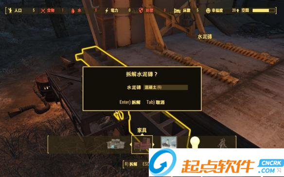 建造独一无二基地的第一步是收集材料,辐射4自由度神高的一点在这里也体现了出来,在可搭建房屋的地基附近长按【V】键进入建造模式,这时按【R】键可以拆解几乎可见的任何物体,包括一堆废墟的房屋、路灯、轮胎等等,旧房子拆了会变为一块平地供建成新的房屋。