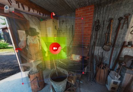 多边形交互热区,这个功能也是相当不错的,特别是在制作图片展或是全景分辨率不高的情况下,我们可以为墙上的一张图添加多边形热区,然后通过皮肤ID来控制从外部调入单独的清晰图来显示,还可以设置当鼠标移动到热区上时播放一段音乐,在使用上很灵活。建立多边形交互热区的方法是选择多边形交互热区工具,然后在需要的地方双击开始绘制需要的图形完成后点右键结束。如图蓝色区域为已经完成的交互热区,红色为正在描绘的交互热区。