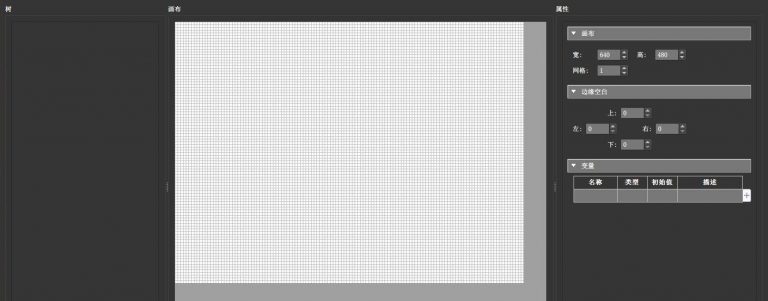 左边是“树”,有点逻辑树的意思,我们所有的元素既相互的逻辑关系都在这里显示。中间是可视化的画布,所有的元素都在这里排布,所见即所得。右边是相关参数的设置。