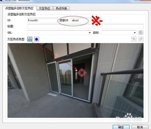 回到“点形和多边形交互热区”选项卡,在这个选项卡中,我们可以看到主要有两种热点类型一是交互热点,二是多边形交互热区,在这个面板中重要的一是热点和热区的开关,二是皮肤ID,为什么说皮肤ID是重点,这是因为如果我们不想使用软件提供的默认皮肤或者说样式,就要通过皮肤ID来与后台皮肤文件联系以用别的样式来替换默认的那个红色目标按钮。添加交互热点的方式很简单,选择交互热点,然后在全景图合适位置双击即可加入交互热点。