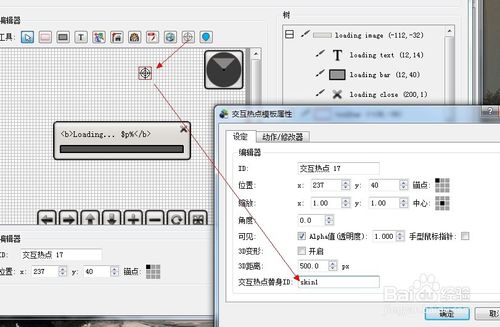按图所示,选择新建热点皮肤按钮,在场景上设置一个代替皮肤按钮,然后双击,可以打开“交互热点模板属性”对话框,在这个对话框的最下有一项“交互热点替身ID”,在这里添入前面我们加的交互热点的皮肤ID名就可以建立前台的热点与后台交互热点间的联系,然后 我们可以diy一个箭头,放在这个热点下就可以用它把前面的那个红色热点代替掉。