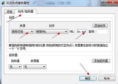 设置完样式,还要设置交互热点的动作,此时选择“动作/修改器”,可以打开以下面板,通过对动作的来源(事件)和动作进行设置让全景完成相应的操作。