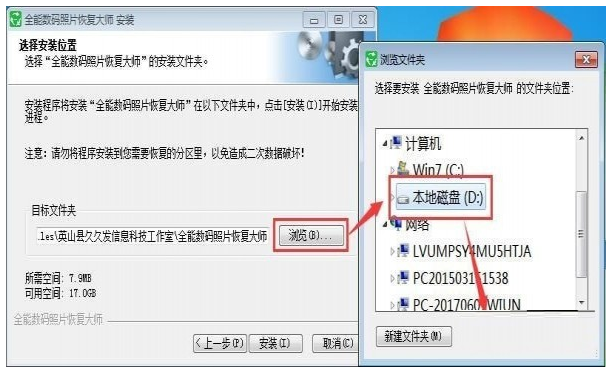 4.这一步我们需要确定全能数码照片恢复大师的安装路径,安装程序有默认的安装路径:C:Program Files英山县久久发信息科技工作室全能数码照片恢复大师。安装全能数码照片恢复大师至少需要7.9MB磁盘空间。需要修改路径的朋友可以点击浏览按钮,选择需要安装的文件夹后,点击好就可以修改安装路径了。点击安装将全能数码照片恢复大师安装到电脑上;