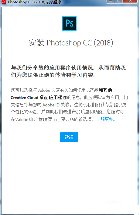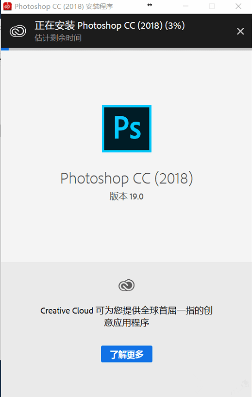 4.这个时候自动开始安装了,软件默认是直接安装到C盘的哦安装路径是C:\Program Files\Adobe\Adobe Photoshop CC 2018 之后破解软件会需要用到这个路径的哦!