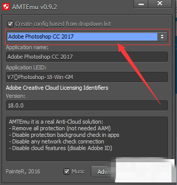 8.注册机里面第一个选项卡点击下拉找到 Adobe Photoshop CC 2018选中它。选中后界面是这样的: