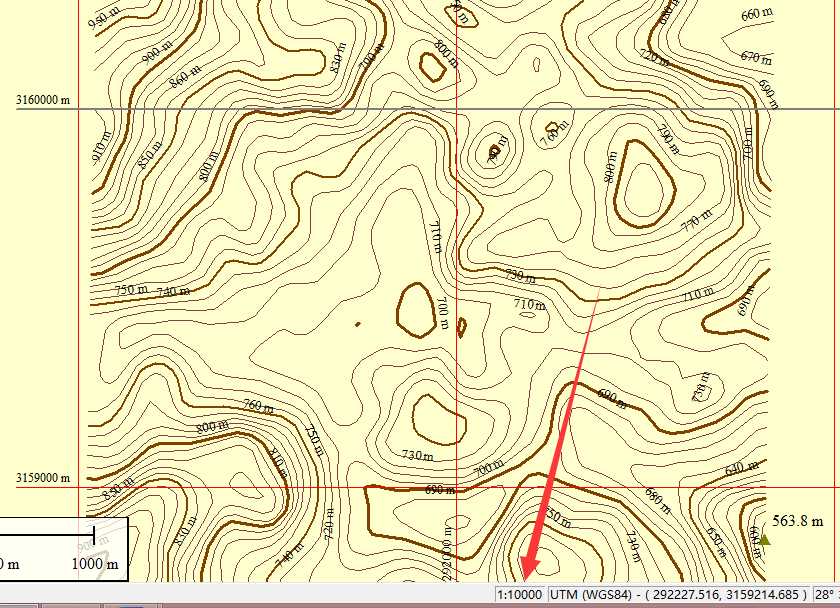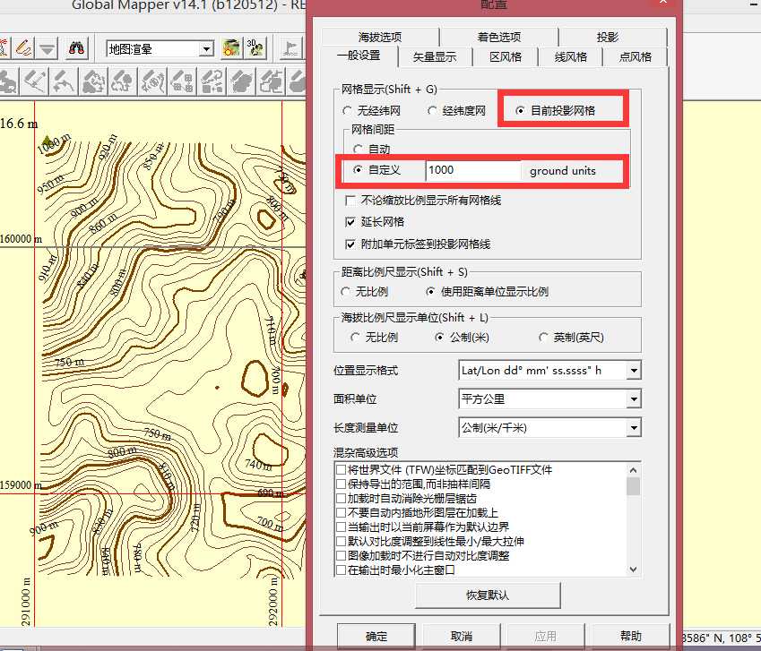 选择“目前投影网格”,并在“网格间距”中选择“定制”“1000”的地面单位。这代表图上一方格长宽皆是1000米(由于地球的不规则形状,UTM方格并不是严格意义的正方形,只是近似正方形,但不影响使用,它的优点是非常方便估算两点间的距离和定位,不需要借助比例尺进行计算),你也可以选择用坐标网格,那么他标的就是坐标了。这样,也可以很快地知道现在看的是哪里,如下图: