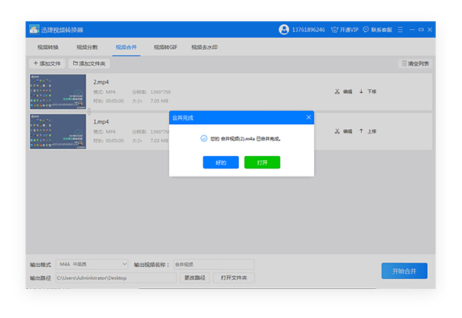 3、合并完成的视频默认保存到桌面,也可以点击“打开”按钮打开已合并视频所在的文件夹,并自动定位到视频所在位置