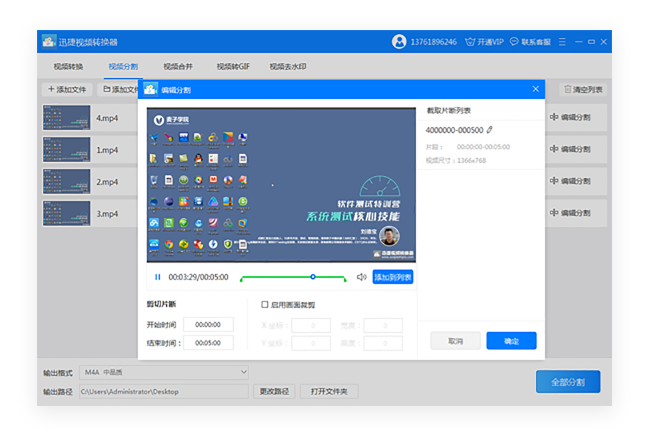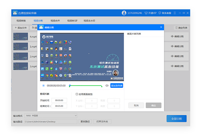 3、拖动视频进度条到剪切位置,点击“添加到列表”按钮添加一个段落,可添加多个段落,点击“确定”按钮段落添加完毕