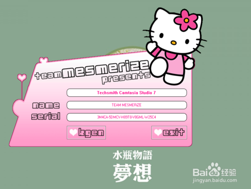 1、打开camtasia_studio7.10中文版软件包中的注册机,其界面如下图,可以看到其上面带有注册名及序列号;