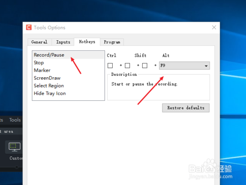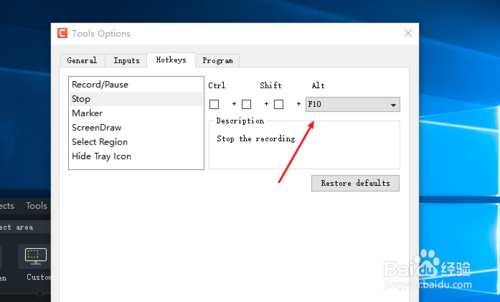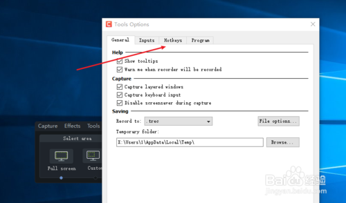 4、从默认的界面切换到热键hotkeys 来看一下几个常用的录屏快捷键。