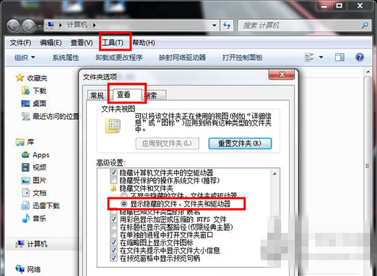 2、安装完成后,我们先到计算机-文件夹选项-查看里设置“显示系统文件和隐藏文件”