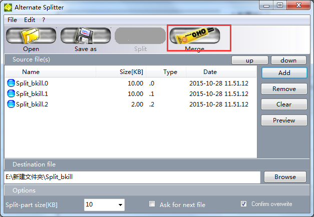 5、选择分割后的文件,点击【Merge】按钮即可将分割的文件合并