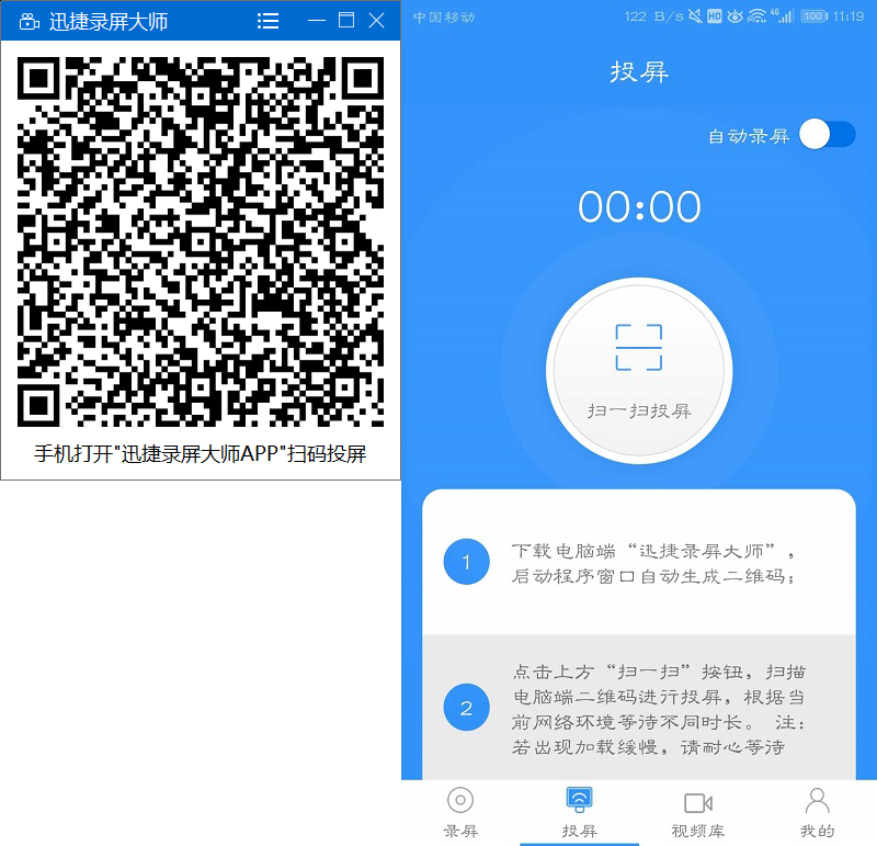 第一步:先打开电脑上安装的迅捷录屏大师,打开之后根据电脑端提示再打开手机上安装的迅捷录屏大师APP。