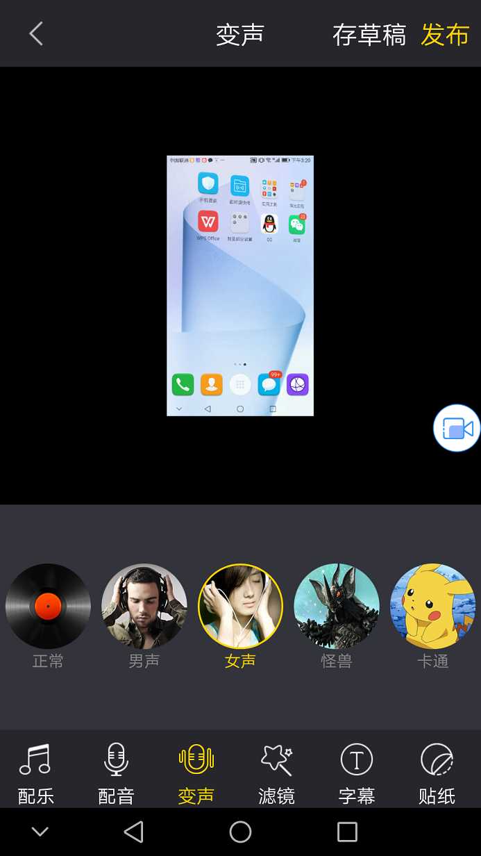 5、给视频变声,有男女声、怪兽、卡通等多种音色可选择。