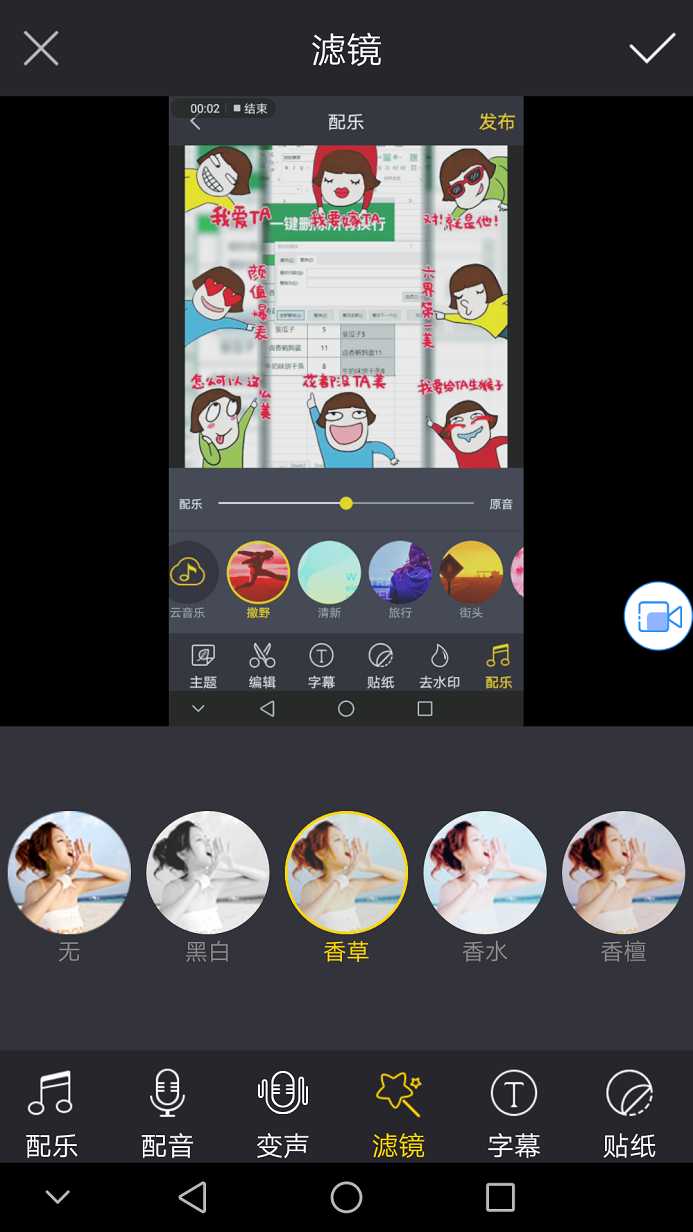 6、给视频添加滤镜,有黑白、香草、香水等多种滤镜可选择。