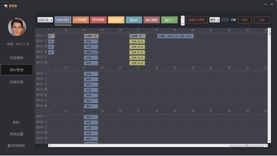 在完成课程设置后,点击课时管理,即可进入课时管理界面,课程安排,勤学宝采用可可视化的现金管理机制。上面的顶部是把老师所建立所有课程,用不通颜色标注出来,老师需要排哪一门课的时间,直接点击课程图标,然后移动到想排课的时间点,点击即可排下改节课,排好的课可以自由拖动增加或较少时间,也可以随自己的意愿拖动到自己想要的时间节点,更可以向下拉动角标,实现多次排课等。已经被其他课程占据的时间段是不能重复排课的。老师可以通过本功能清楚的了解到他后面每一天的时间安排,一边其准时上课。