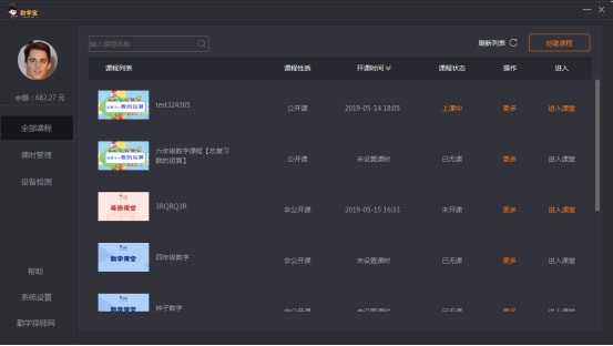 另一种是非公开课,此类课程是属于私密的课程,别人无法在任何网站或系统里面搜索到课程的相关信息,包括教师资料、学生资料、课件等。点击左上角的创建课程按钮,输入相关的课程介绍,以及课程封面图片,然后按提示输入学生列表(学生无需另外注册帐号,直接把学生手机号输入,系统即可自动生成改学生帐号密码,密码与帐号一直;老师一次输入此学生帐号后,在此后的其他课程选择学生时学生资料会自动弹出供老师选择),学生列表也可以是由 Excel表格来导入进来;下一步则是根据提示,把课程的PPT上传,如果此时还没有PPT,老师也可在上课的时候再把PPT传上去。完成前面几步后,点击确认就可生成自己的课程了,课程所选择的学生,在其软件里面也就能看到此课程信息。但课程设置好后尚未能进入课室,需要下一步设置好课时之后方可进入。