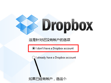 首先把 Dropbox 客户端下载到电脑上,然后点击安装,接着会出现帐户选项。这里有二个选项,一个是针对还没有创建 Dropbox 帐户的,另外一个是已经有帐户的。如下图所示