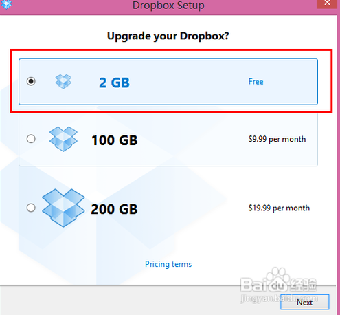 接下来,软件会让我们选择使用的容量。默认的是 2G 的免费空间,另外还有二个 100G 和 200G 的分别是每月 9.99美元和 19.9美元。如下图所示