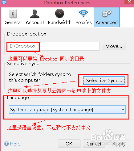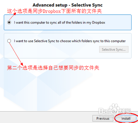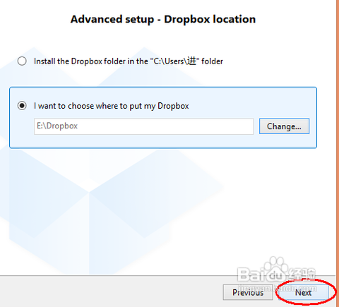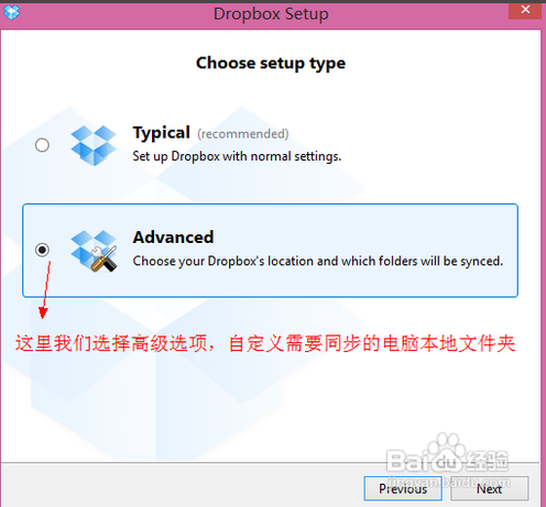 选择了空间以后,接下来选择 Dropbox 在本地电脑端同步的文件夹,这里我们选择“Advanced”,如下图所示