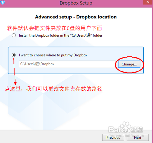 这里有二个选项,一个是软件默认的安装同步文件夹的位置,是在 C 盘下用户目录中。另一个是我们可以自定义的路径,如其它盘 D、E、盘都可以。我们点击“Change”,如下图所示
