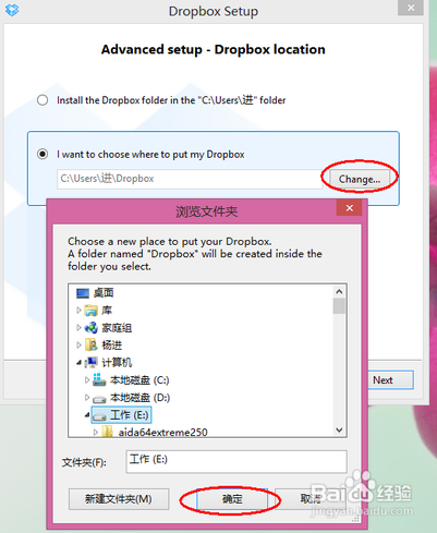 我选择把要同步的文件夹放在我的“E:盘”,然后点击“确定”,如下图所示