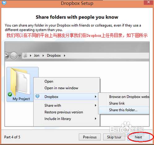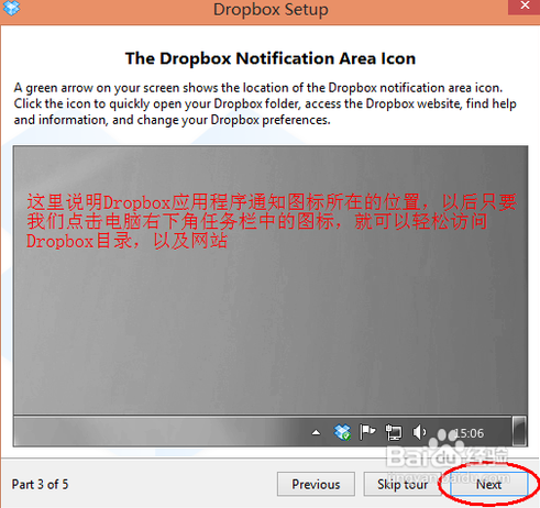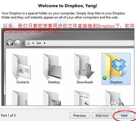 Dropbox 的程序通知图标会出现在系统右下角的任务栏中,双击这个图标就会直接打开 Dropbox 在电脑本地的目录。点击“Next”,继续,如下图所示
