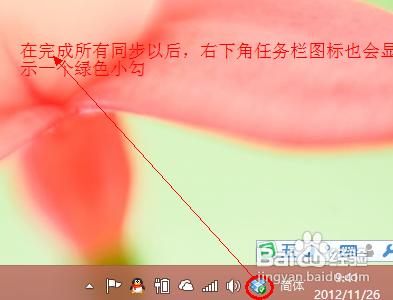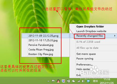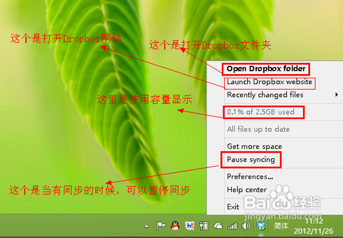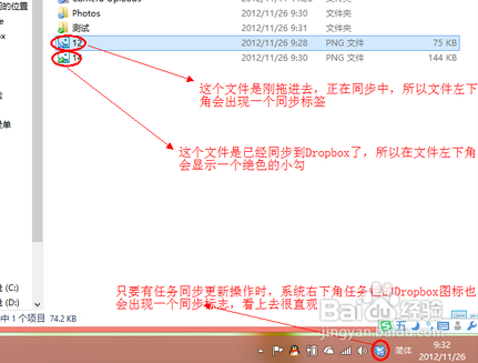 接下来我们随便拖动二个文件到 Dropbox 中,看看系统右下角任务栏中的 Dropbox 通知图标会有什么变化,如下图所示