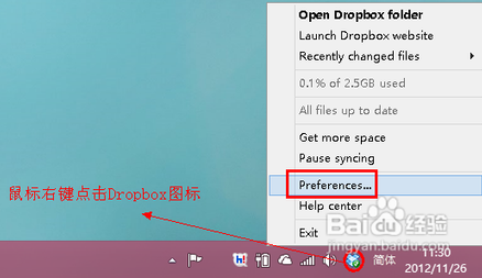 我们用鼠标右键点击系统右下角任务栏中的 Dropbox 图标,然后选择“Preferences”,如下图所示