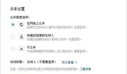 共享是Google Drive一大特色,通过共享,可以让你授权范围内的人都有权对文件进行修改,而修改也会实时保存,这样大大提高了协同作业的效率。共享的步骤很简单,选取文件,点击分享按钮。接着选择公开程度,就可以将文件分享出去了。