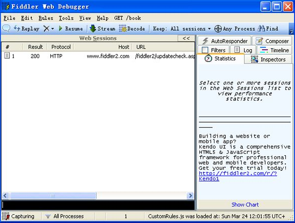 1. 开发fiddler之后默认情况下就是抓包状态,可以查看界面左下角显示capturing,如果没有显示,单击此处可以开始抓包。