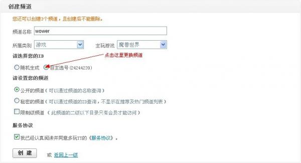 2、输入频道名称,填写频道主打游戏。写入简单的频道介绍,选择所要建立的频道用户主要的网络类型。目前频道都是双线频道,所以不需要选择频道线路。