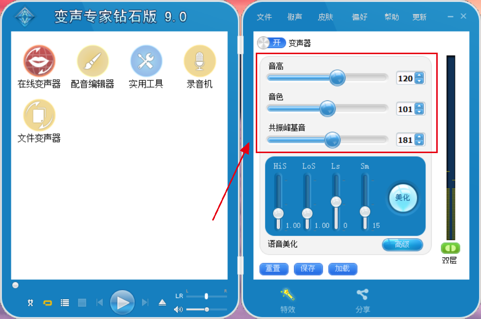 还可以移动“音高、音色、共振峰基音”、“高级”、“语音美化”等功能参数进行微调,配置更满意的变声。