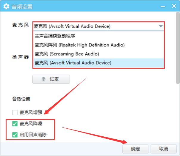 第三步:在弹出的“音频设置”窗口,下拉“麦克风”菜单,将输入设备设置为Avsoft Virtual Audio Device。最后勾选“麦克风降噪”和“启动回声消除”即可实现YY直播变声。
