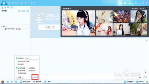 第四个图标是按键说话,快捷键可以自己改,设置为按键说话的时候要一直按住说话对方才能听到,当然也可以鼠标点一下,那样就会一直处于语音状态。