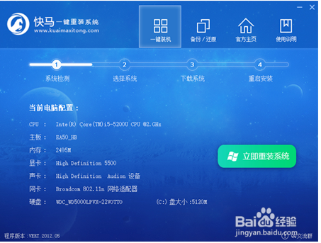 1.系统检测:从本站下载压缩包之后打开快马一键备份还原系统,然后在系统检测的选项中我们就可以看到“立即重装系统”的命令,然后点击它进入系统重装。