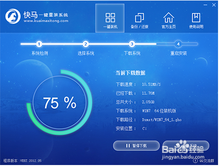 3.安装系统:进入了系统镜像下载窗口,这时候大家只需要等待下载完成就可以了,系统下载完成后会自动安装系统的,快马一键重装系统支持断点下载,也可以暂停下载!