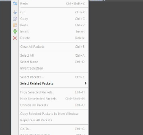 4、编辑模式,选择相关的数据包、隐藏选定的数据包、隐藏未选定包、显示所有packetscti、将选定的包复制到新窗口、处理所有的包