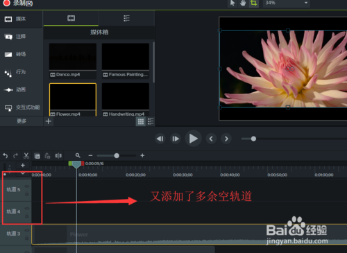 我们看到Camtasia 2019时间轴窗口默认只有三个视频轨道,放入三个视频对象后视频轨道就不够用了。