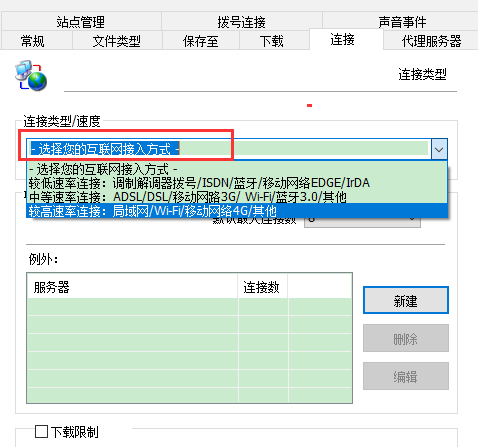2.“连接类型/速度”的下拉选项选择最后一个“较高速率连接”