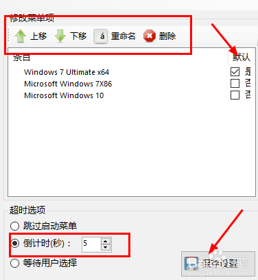 在编辑引导菜单处,你可以上下移动引导项,自定义默认启动项和重命名启动项名称,以及等待时间,最后不要忘了保存设置。
