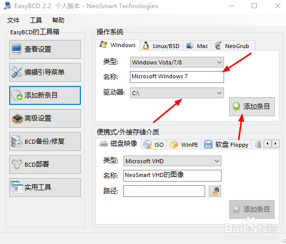 你还可以添加新条目,若你电脑没有某启动项,那就自己添加。选类型,自定义名称,一定要注意驱动器!既是你系统安装的那个盘符。