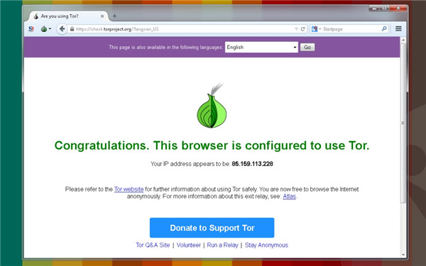 要检查它是否正常工作,您可以使用在线Tor探测器来查看您是否匿名冲浪 。连接可能需要一些时间,具体取决于任何时候登录网络的用户数量,但通常非常快。成功连接后,Tor洋葱徽标在任务栏中从黄色变为绿色。
