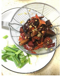 3.不用太多油来炸虾,比炒菜稍多一点就可以了,先把辣椒段下入小火煸香捞出备用。