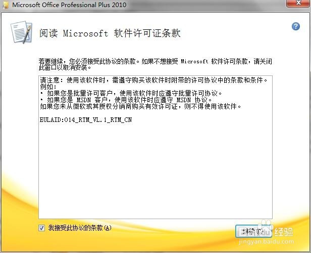 3、进入Office 2013安装页面,选择“我接受此协议的条款”后,点击“继续”安装软件;