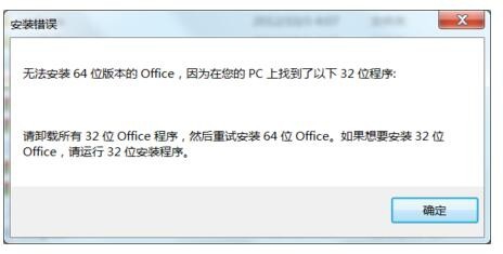 打开安装64位的office,安装过程中提示无法安装64位office,因为已有32位版本,安装不能继续