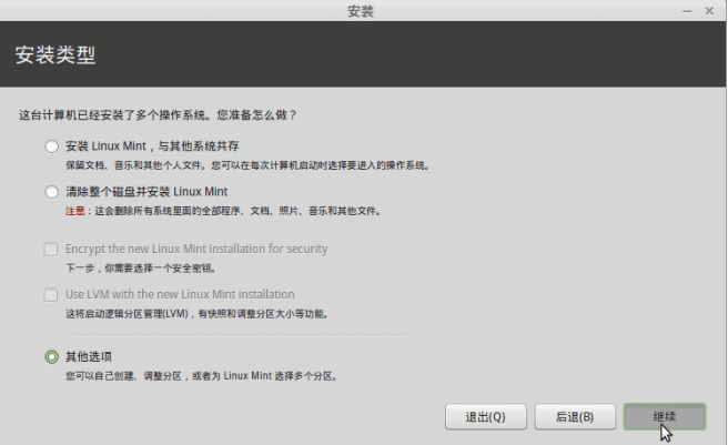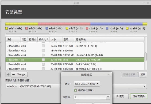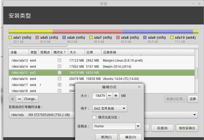 挂载一个"/home"分区。我个人喜欢将/home文件夹单独弄一个分区。这样做的目的是,当你重装格式化系统分区的时候,用户文件夹里的数据都不会丢失。我的13个linux发行版共用一个20G左右的/home分区,完全够用。当/home分区已经有资料的时候,就应该选择跟以前相同的分区格式,并且不要勾选“格式化分区”。