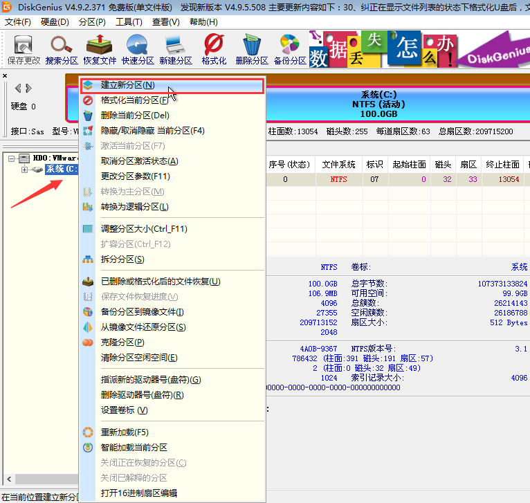 打开分区大师后,右键选中系统盘,在弹出的菜单中选择“建立新分区”。
